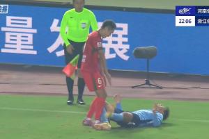 张瑷晖倒地夹住皮球,王上源上去对着皮球连踢了几脚