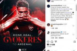 经纪公司社媒晒出约克雷斯加盟阿森纳的海报,配文:“来到伦敦!我们的瑞典球星约克雷斯已经与英超豪门阿森纳签下了长期合同!”
