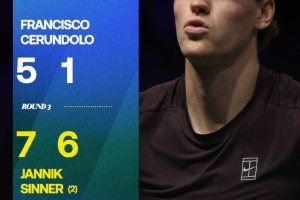 强!辛纳2-0塞伦多洛,晋级巴黎大师赛8强,解锁大师赛全8强成就