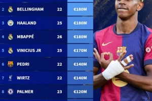 体育资讯8月7日讯 金球奖30人候选名单公布,德转也盘点了30人身价榜单,其中亚马尔2亿欧居首,具体如下(身价相同年龄小者在先):