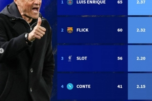 体育资讯8月7日讯 2025年男足最佳教练(克鲁伊夫奖)候选人公布,德转也盘点了5名主帅在24/25赛季带队场均积分榜,具体如下: