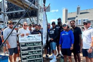 乔丹带着二儿子马库斯一起参加,捕获最大的鱼仍是10号那天的71磅(32公斤)白马林鱼。