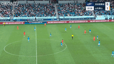 比赛第23分钟,谢文能精准传中,卡扎伊什维利头球破门,场上比分深圳新鹏城0-2山东泰山。