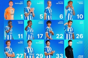 布莱顿首发:1-维尔布鲁根、5-邓克、6-范赫克、10-鲁特尔、11-明特、17-巴莱巴、22-三笘薰、26-亚辛-阿亚里、27-韦弗、29-德库耶佩、33-马特-奥莱利