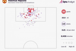 数据网站OPTA也盘点了霍伊伦曼联生涯射门效率情况,他在各项赛事6406分钟登场时间中完成115次射门,打进26球,平均每246分钟打进一球。