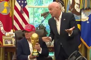 因凡蒂诺拿着大力神杯对特朗普说道:“这个奖杯只属于赢家,你是胜者,当然你可以摸摸它。这很重,上一位捧起这座奖杯的人是梅西,现在奖杯就在这里。”