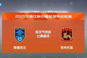 南通支云本轮中甲对阵苏州东吴,比赛进行到60多钟的时候因天气原因暂停,据南通支云官方表示,因雷暴天气,比赛暂停。目前,场上比分仍是0-0平。