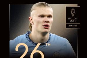 曼城前锋哈兰德排名第26名,这是他第五次获得提名。