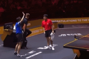 林高远不敌梁靖崑无缘晋级后,离场时遗憾的摸了摸两边球台