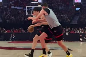 开拓者队内表演赛:杨瀚森挨了克林根一肘倒地 举着双手缓缓起身