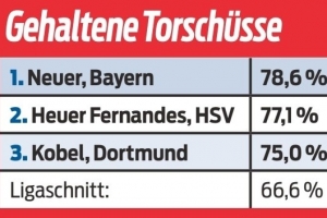 体育资讯10月8日讯 《体育图片报》统计了本赛季门将在德甲联赛中的扑救成功率,并列出前三名榜单,拜仁39岁门将诺伊尔以78.6%居首。