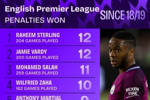 体育资讯10月12日讯 Squawka统计了2018-2019赛季以来球员在英超造点的次数,并列出榜单,斯特林、瓦尔迪12次居首,萨拉赫11次第三。