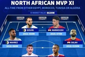 体育资讯10月15日讯 德国转会市场列出了北非国家(埃及、摩洛哥、突尼斯、阿尔及利亚)球员历史身价最高阵容,萨拉赫、马赫雷斯、马尔穆什在列。