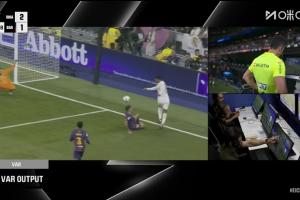 加西亚禁区内手球,VAR介入判罚点球,姆巴佩点球被扑