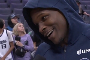 谈到本场赛后将自己的球衣送给球迷,他说:"这对我来说意义重大,因为当年KD代表雷霆来亚特兰大(爱德华兹家乡)比赛时,我也曾是看台上的小孩。我总是希望能得到一件球衣,但每次都坐在山顶位。