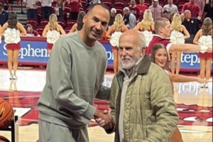 今天他现身NCAA赛场,观战阿肯色大学vs桑福德大学的比赛。