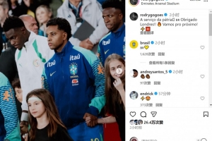 此役罗德里戈为巴西队首发出战,定位球助攻卡塞米罗破门,赛后罗德里戈社媒晒照庆祝胜利,配文:“为国出战,感谢伦敦!专注于下一场比赛!”