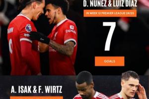 今年夏窗利物浦花费1.45亿欧元+1.25亿欧元签下两大新援伊萨克和维尔茨,但12轮英超过后,两人颗粒未收,只有伊萨克在联赛杯中打进一球。