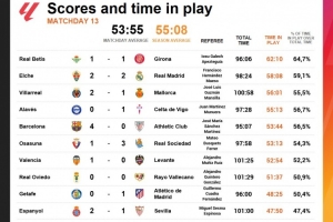 体育资讯11月25日讯 Opta统计了西甲第13轮比赛的净比赛时间,本轮场均净比赛时间为53分钟55秒,而本赛季西甲场均净比赛时间为55分钟8秒。