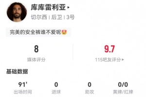 体育资讯11月26日讯 切尔西在本轮欧冠3-0完胜巴萨,库库雷利亚本场数据如下: