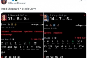 赛后火箭媒体人@BiasedHouston晒出谢泼德和库里本场数据,写道:“谢泼德>库里。”