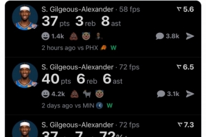 赛后美媒Real Sports晒出了亚历山大近三战数据,写道:“SGA应进入历史级别得手的讨论。”