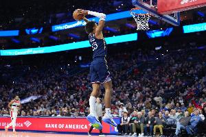 76人双向前锋巴洛上半场出战17分钟,5中3,三分1中0砍下6分9篮板2助攻2盖帽,正负值+22。
