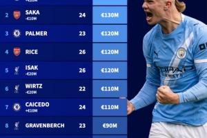 体育资讯12月09日讯 今日德转更新新一期英超球员身价,哈兰德2亿居首,伊萨克降至1.2亿,维尔茨降至1.1亿。