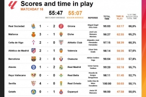 西甲第16轮净比赛时间(括号内为总时间占比):