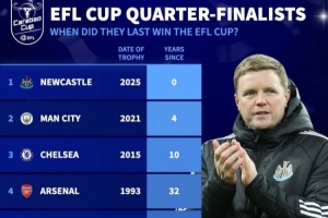 体育资讯12月16日讯 英格兰联赛杯八强战即将开战,《转会市场》也统计了八强球队上次在联赛杯夺冠距今的时间。