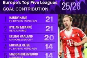 2025-26赛季五大联赛参与进球(进球+助攻)数据: