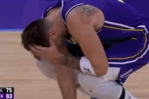 GIF-东契奇扑防底角三分被打到头部