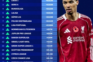 体育资讯12月31日讯 德转统计了2025年欧洲联赛整体的身价上涨和跌幅排行榜,英超断层领先排名榜首。