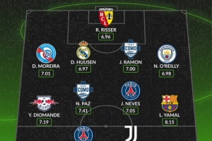 后卫:迭戈·莫雷拉(斯特拉斯堡,7.01分)、赫伊森(皇家马德里,6.97分)、雅各布·拉蒙·纳韦洛斯(科莫,7.00分)、奥赖利(曼城,6.98分)
