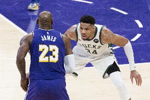 此役,字母哥出战31分钟11投9中,罚球4中3砍下21分6篮板5助攻2抢断2盖帽;詹姆斯上场33分钟,21投10中得到26分9篮板10助攻3抢断。