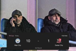 体育资讯01月11日讯 足总杯第3轮,曼城10-1狂屠英甲球队埃克塞特城。本场比赛,瓜迪奥拉因为累计三黄停赛而作壁上观。