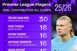体育资讯1月14日讯 Squawka统计了本赛季英超球员各赛事的参与进球数量,并列出榜单,哈兰德参与30球断层居首。