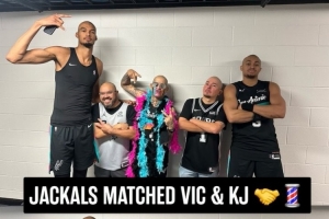 马刺主场大胜雄鹿,赛后,文班亚马和凯尔登·约翰逊与主场球迷团三位光头球迷合影,马刺官推写道:“看来光头造型正在流行~”