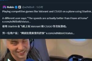 体育资讯1月16日讯 马斯克转载用户在飞机上使用星链体验无畏契约和CS的视频,视频中用户表示除了能够流畅游戏外,网速甚至比家里还快。