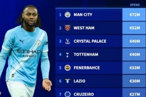 体育资讯1月19日讯 德转盘点了冬窗至今花费榜单,其中曼城居首,具体如下: