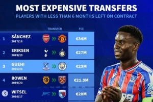 体育资讯1月20日讯 曼城已经官宣引进水晶宫中卫格伊,《转会市场》统计显示他也是合同仅剩不到半年情况下的历史第3贵球员。