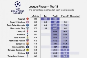 体育资讯1月20日讯 opta预测了本赛季欧冠联赛阶段的预期积分,以及直接晋级前八和参加附加赛的概率。阿森纳将93.9%获得联赛阶段头名,拜仁仅5.5%概率获得头名。