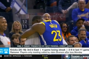 该记者表示:“我们都知道唐斯和德雷蒙德·格林相处得不好,我们看到了他们曾在播客上来回交锋,每次交手都火药味十足,迈克·布朗知道这一点,然而在赛后,当追梦绊倒唐斯的那场比赛结束后,他被看到之后拥抱了追梦并与其谈笑风生。”