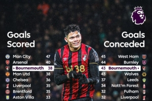 体育资讯1月25日讯 英超第23轮比赛,伯恩茅斯主场3-2击败利物浦,据英超官方统计,伯恩茅斯本赛季英超进球、丢球皆排在第三名。