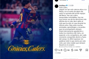 体育资讯1月27日讯 巴萨18岁中场德罗转会巴黎圣日耳曼,德罗社媒发文,与巴萨告别。