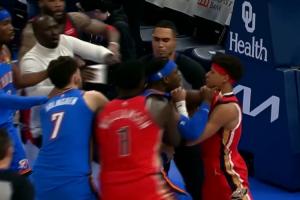 鹈鹕雷霆比赛最后一攻,费尔斯和多特有纠缠,两人互相推搡,加揪衣领,引发大冲突。