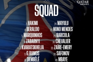 后卫:2-阿什拉夫、4-贝拉尔多、5-马尔基尼奥斯、6-扎巴尔尼、21-卢卡斯·埃尔南德斯、25-努诺·门德斯、51-威廉·帕乔