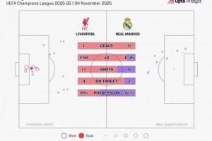 皇马对阵利物浦的预期进球只有0.45,近一年来各项赛事最低