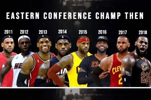 詹姆斯自2011年至2018年连续八年代表热火和骑士夺得东部冠军