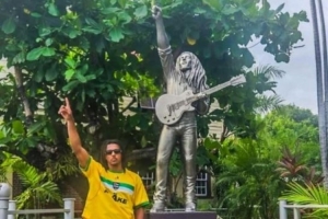 其他照片中还展示了孔德在金斯敦鲍勃-马利故居博物馆的身影,孔德在这位雷鬼音乐之王故居正门前的雕像旁摆出相同手势合影留念。